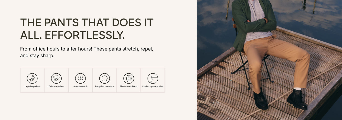 Pants and shorts hat offer the perfect balance of style, durability and comfort. Crafted from recycled, premium 4-way stretch fabric, they move with you while maintaining their shape.With all the tech you love - liquid & odour repellent, and stretch for added flexibility. No compromises on quality or style, just effortless comfort and a polished look, wherever you go.