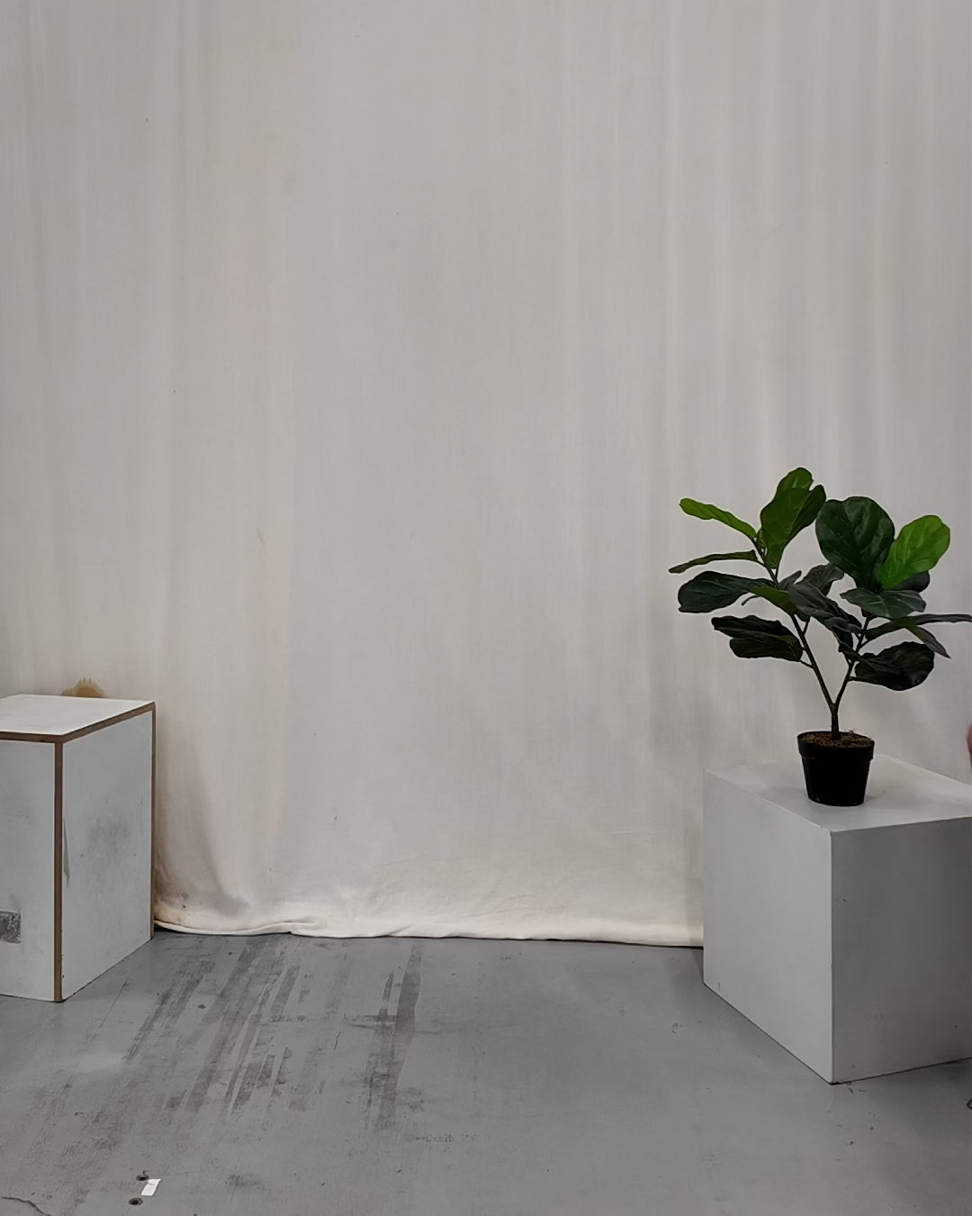Two people sitting on a stool in a studio setting with photography equipment.