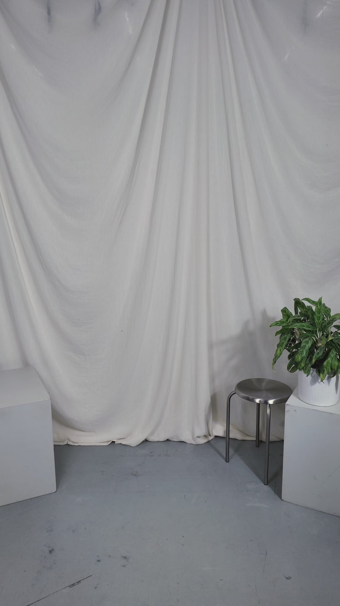 Two people sitting on a stool in a studio setting with photography equipment.