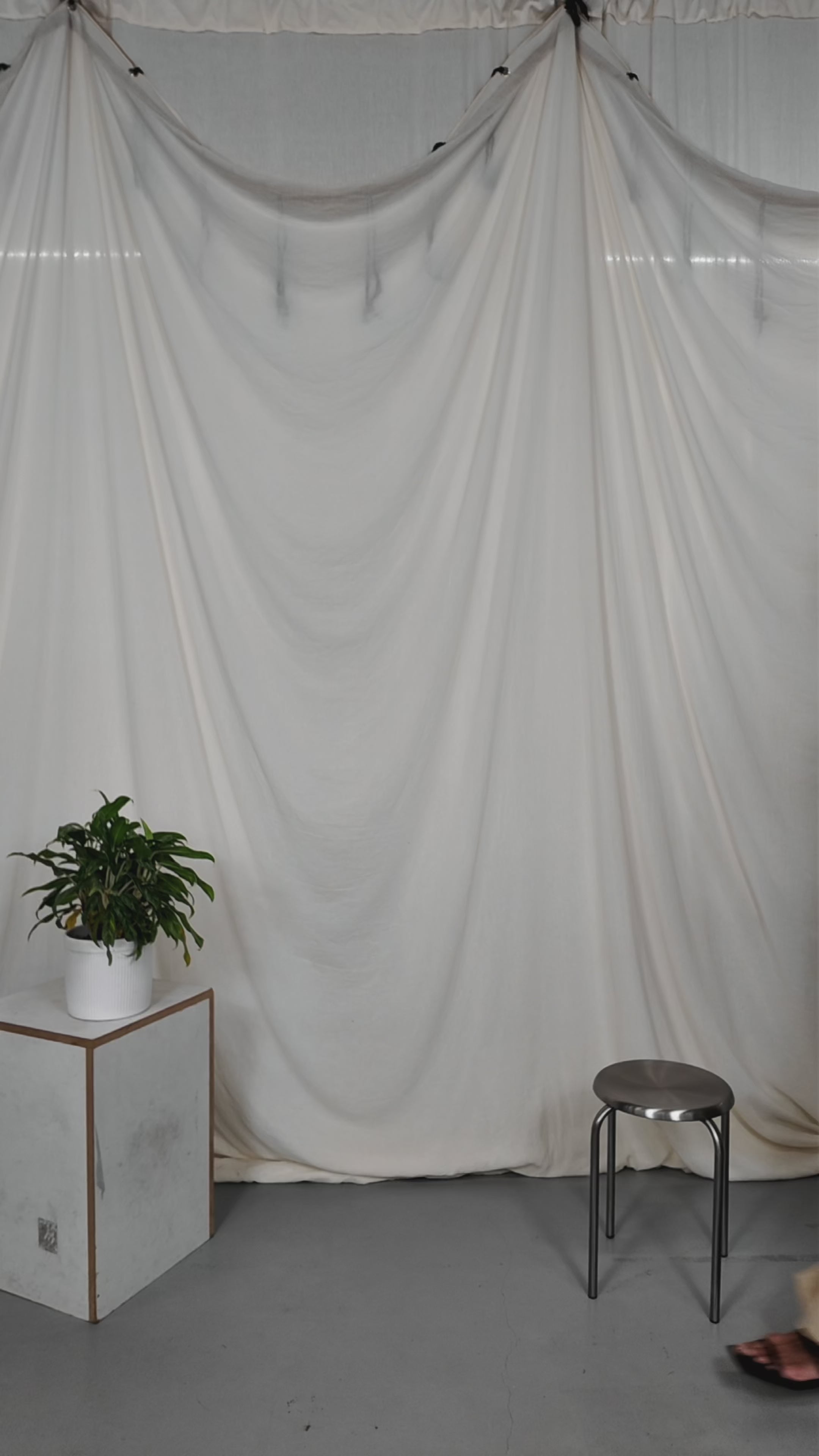 Two people sitting on a stool in a studio setting with photography equipment.