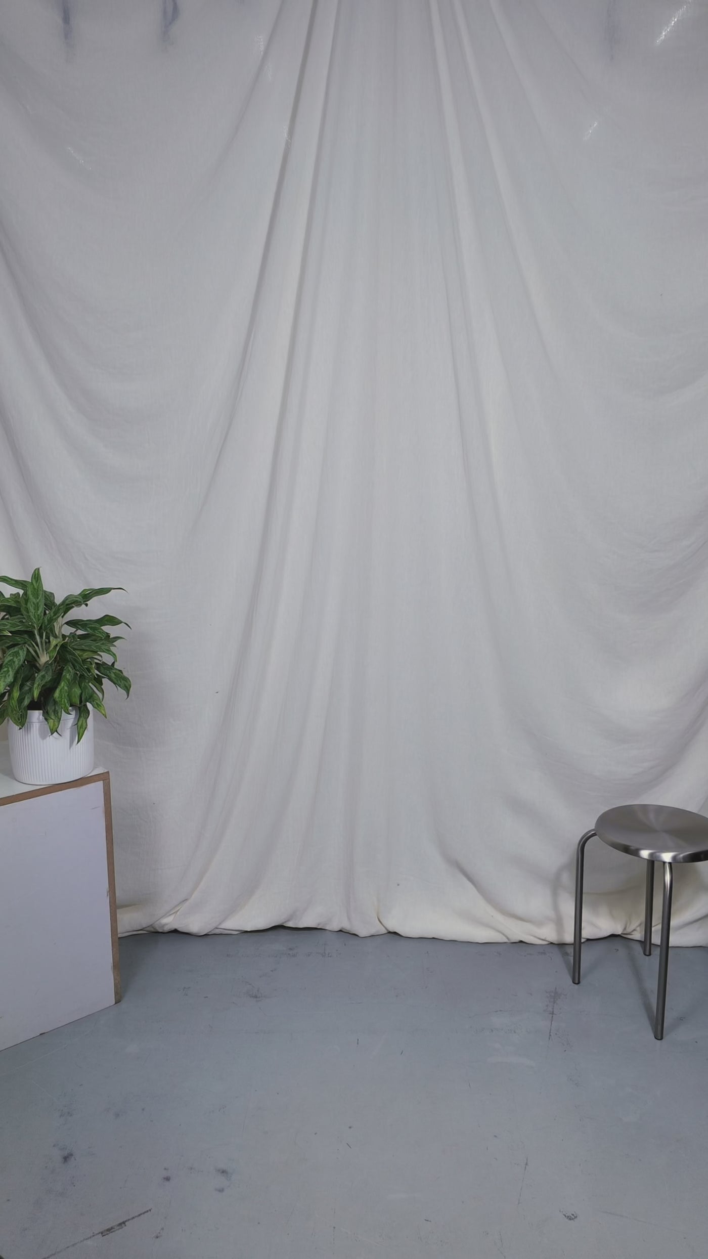 Two people sitting on a stool in a studio setting with photography equipment.