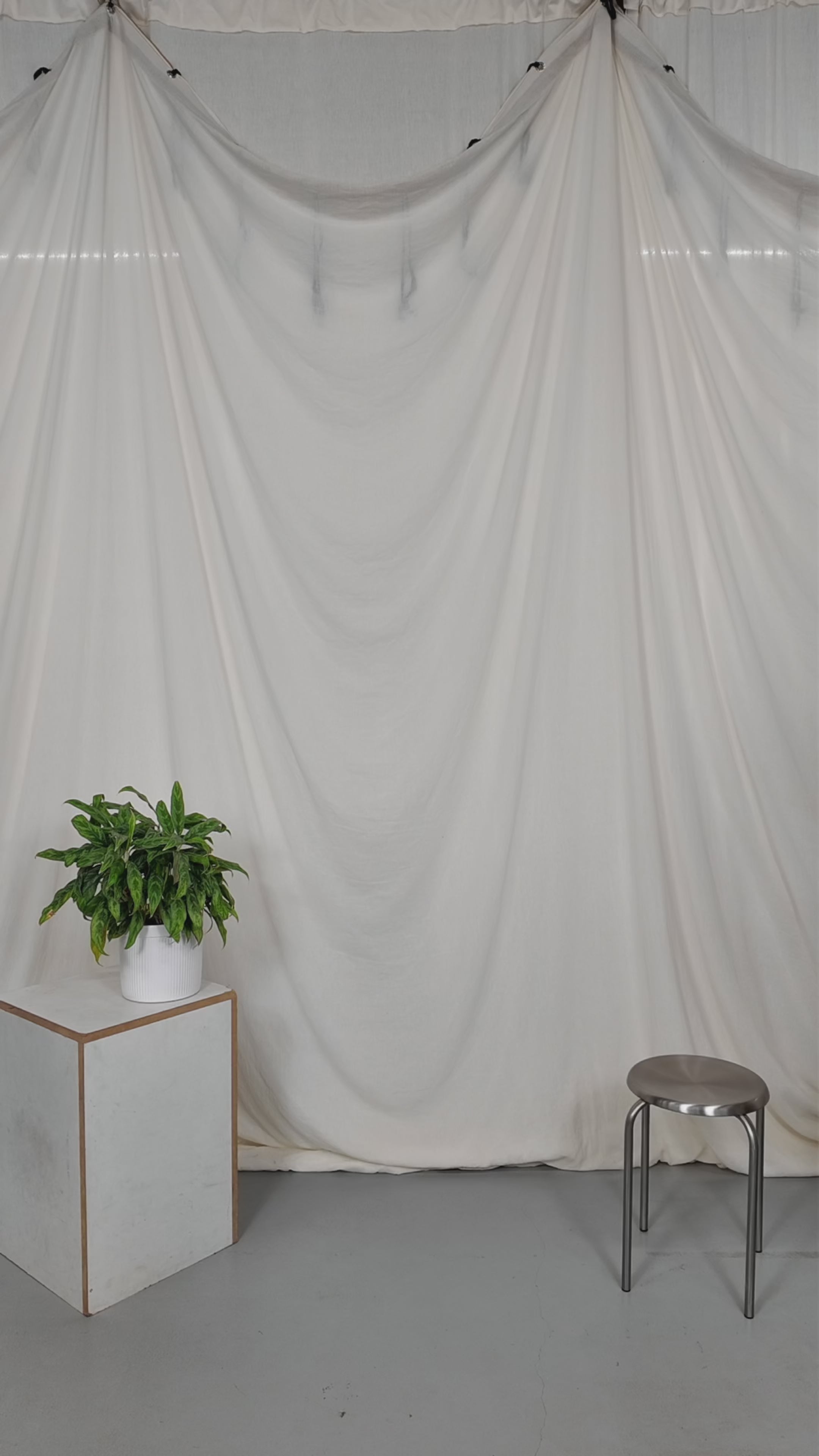 Two people sitting on a stool in a studio setting with photography equipment.